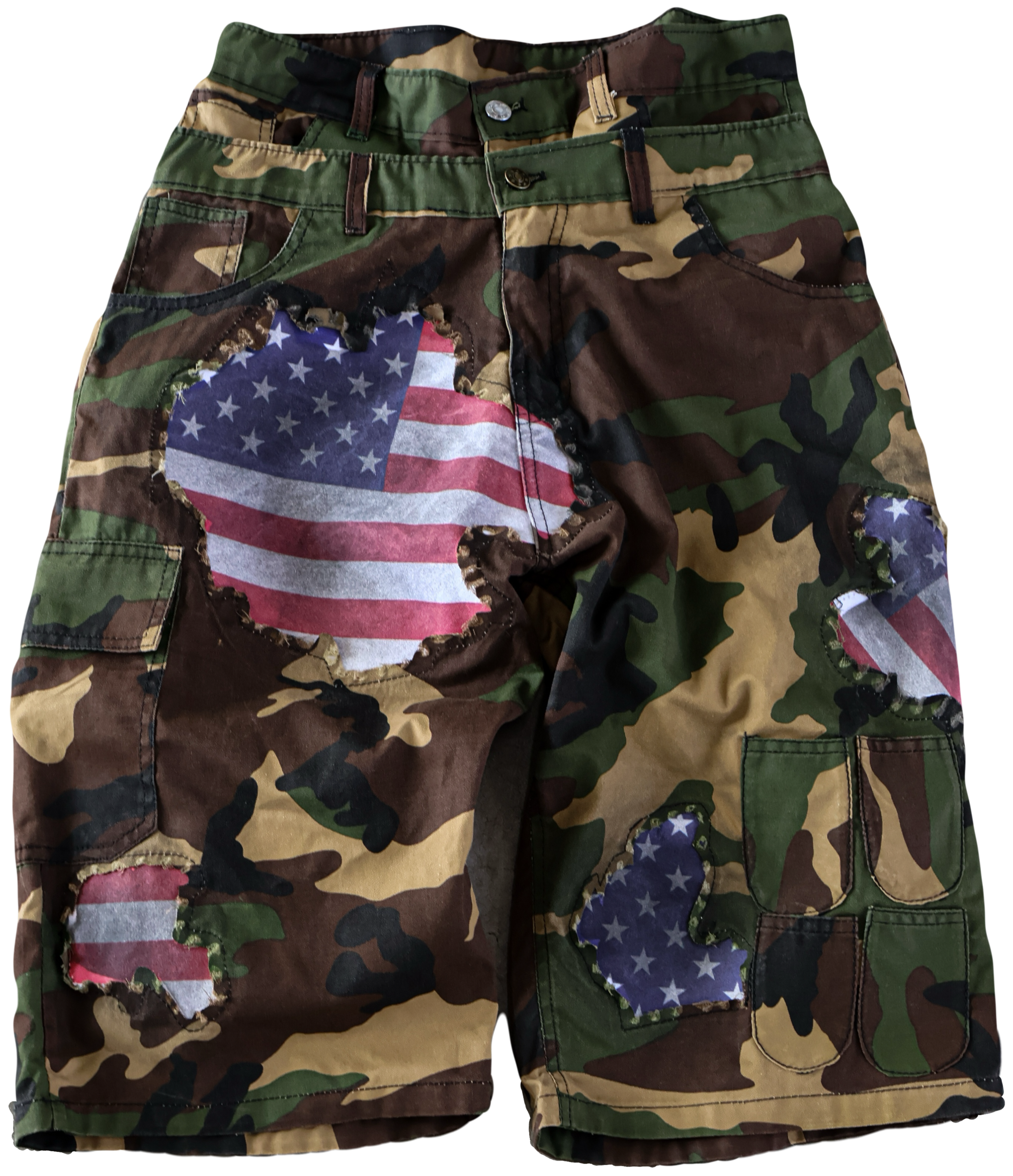 - Distressed cutouts throughout, revealing distressed American flag patches underneath